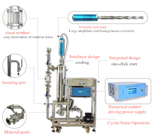 This series combines all the handling, R&D and testing projects of ultrasonic liquid, including the effective combination of ultrasonic driving power supply, stainless steel reactor and flow control system. which can efficiently handle more than 5 liters of samples. With peristaltic pump, temperature detection and pressure detection, the flow direction and velocity can be better controlled, the field working conditions can be simulated, the operation of monitoring system and data collection can be carried out, and the solid-liquid mixing feeder specially equipped for dry powder can be selected. The results obtained by this system can be easily copied to industrial production lines.
